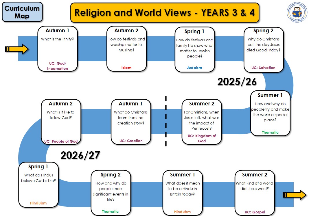 "Religion and World Views at Holy Trinity is central to our school ethos and reflects our vision of ‘Let’s grow together’. Rooted in Christian values, our curriculum recognises and celebrates the diversity of the world in which we live. Through the study of Christianity, Islam, Judaism and Hinduism, pupils develop a secure knowledge and understanding of a range of religions, beliefs and world views.